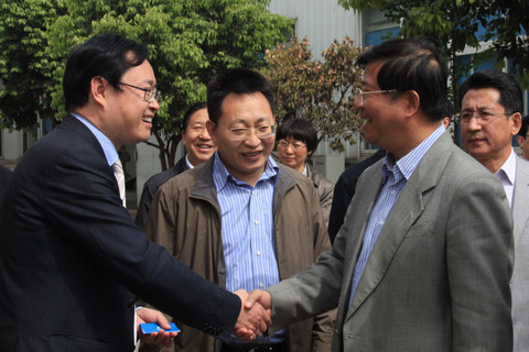 省人大副主任彭渝(右)与李亿中总司理(左)亲热握手